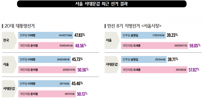 지난해 6월 1일 치러진 서울시장 선거에서도 국민의힘이 승기를 잡았다. 서울시 전체에서는 오세훈 시장이 59.05%(260만8277표)로, 송 전 대표(39.23%·173만3183표)와 19.82%p 차이를 기록했다. 서대문구갑의 경우 오 시장이 57.82%(3만4280표)로, 송 전 대표(39.71%·2만3544표)와 18.11%p 차이 났다.
