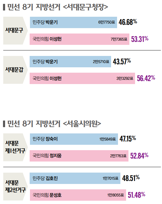 정당만 투표하는 광역의원 비례대표 선거에서 서대문구 전체 결과는 국민의힘이 7만3613표로 50.54%를 기록하며 민주당(43.35%.6만3144표)을 앞섰다.