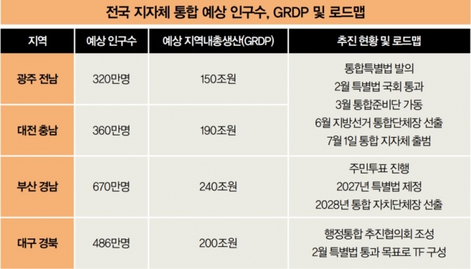 광주·전남과 대전·충남은 현재 ‘통합자치단체장 선출’을 목표로 움직이고 있다. 2월 특별법이 국회를 통과하면, 3월 통합준비단을 가동해 6월 지방선거에서 통합단체장을 선출한다는 계획이다. 이어 오는 7월 1일 통합 지자체를 출범한다는 구상이다.