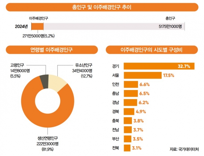 ◇이주배경인구, 지난해 첫 통계…생산연령인구만 80%지난해 우리나라 인구 20명 중 1명이 ‘이주배경인구’인 것으로 나타났다. 3월, 국가데이터처에 따르면 2024년 기준 한국에 3개월 이상 거주한 이주배경인구는 271만5000명으로 전체 인구(5175만1000명)의 5.2%를 차지했다.