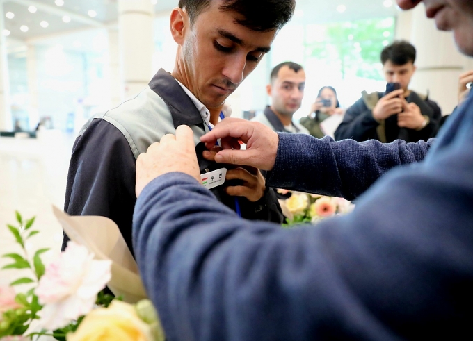 ▲지난해 10월 22일 인천국제공항에서 타지키스탄 고용허가제 외국인 근로자(E-9)의 최초 입국을 기념해 직접 지은 한글 이름표 달아주기 행사가 열리고 있다./사진제공= 한국산업인력공단